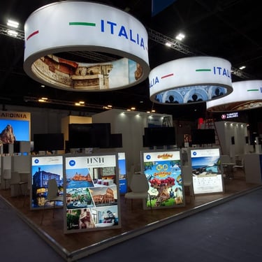 National pavilion exhibition stand delivered for Italy, showcasing tourism and regional destinations. The project involved large-scale coordination, production management, and on-site installation within an international exhibition environment.